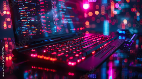 Obraz premium Futuristic Laptop with Code Display and Neon Lights, Nighttime Tech Scene,...