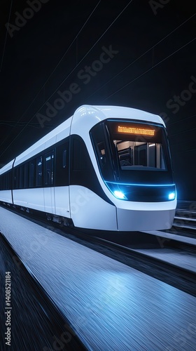 Naklejka premium Futuristic light rail train speeds through a dark tunnel.