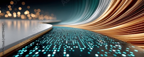 © Georgii, Fototapeta premium Futuristic light tunnel with curved glowing roadway and digital dot surface inspiring motion and energy