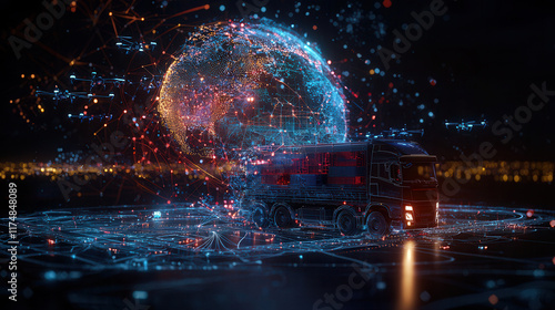 Obraz premium futuristic logistics hub with truck and drones delivering goods globally,...