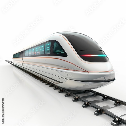 © fair, Naklejka premium Futuristic Maglev Train Speeding on Tracks, High-Speed Transportation Technology on Isolated White Background with Copy Space