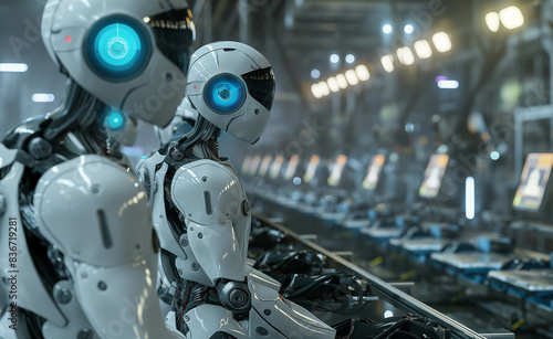 Fototapeta premium Futuristic manufacturing plant where AI-powered robots, equipped with advanced computer vision systems, inspect and assemble products with incredible precision.