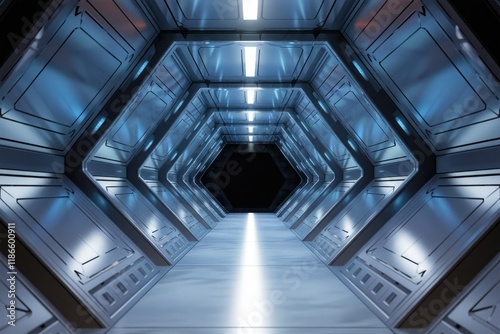 Obraz premium Futuristic metallic corridor with hexagonal walls and bright lights leading to a dark end.