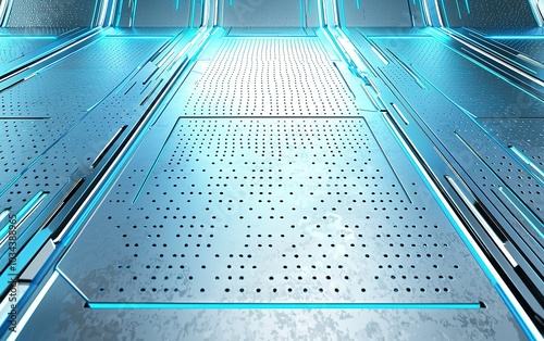 Obraz premium Futuristic metallic floor embedded with blue lighting and perforated patterns...