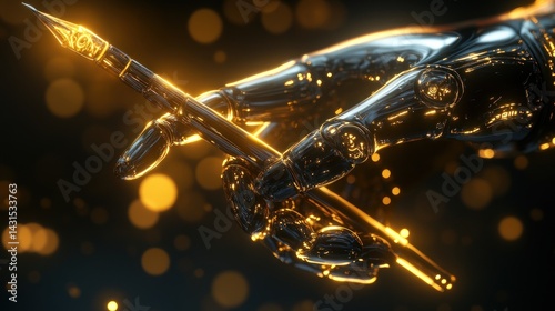 © ARA graphics, Naklejka premium Futuristic metallic hand holding a pen