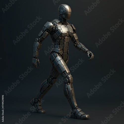 © Khaisan, Fototapeta premium Futuristic metallic humanoid automaton in motion on a dark background