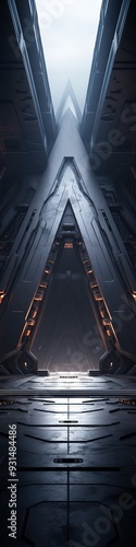 Fototapeta premium Futuristic metallic structure with glowing lights and a narrow pathway.