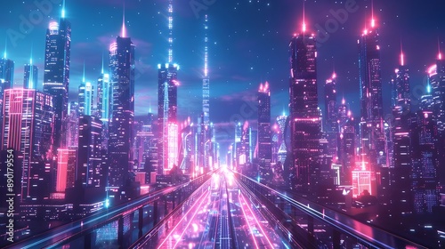 Naklejka premium Futuristic Metropolis at Night with Glowing Neon Lights and Advanced...