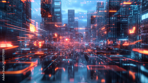 Obraz premium Futuristic metropolis showcases glowing digital lines and skyscrapers in a...