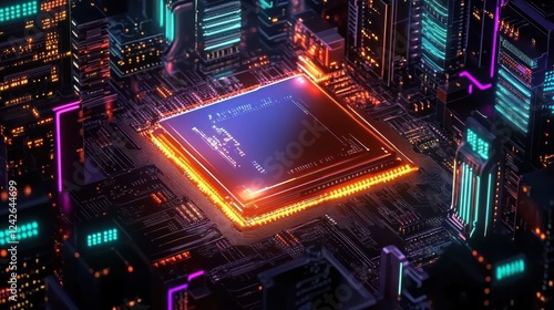 © artbot, Fototapeta premium Futuristic microchip glowing in a vibrant cityscape at night