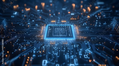 Obraz premium Futuristic Microchip on a High-Tech Blue Circuit Board, Representing Advanced...