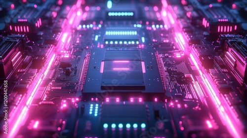 Fototapeta premium Futuristic Microchip Processor Illuminated with Neon Lights in Cyberpunk Style