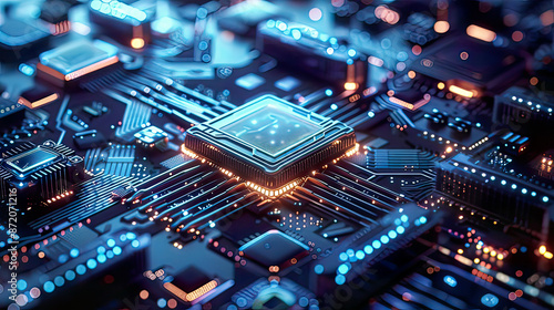 Obraz premium Futuristic microchip processor with lights on blue background quantum...