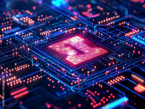 © mim, Obraz premium Futuristic Microchip Representing AI and Big Data Processing with Digital Circuitry and Glowing Elements