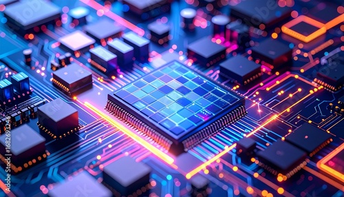 © Zakia, Obraz premium Futuristic microchip with integrated chessboard pattern and glowing circuitry