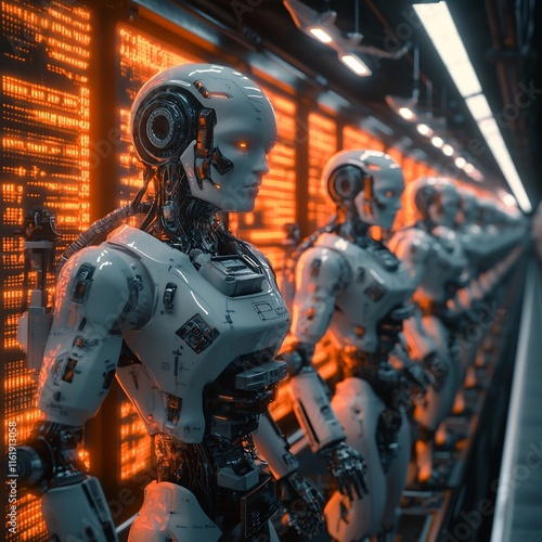 © Siriroj, Fototapeta premium Futuristic military soldiers in a high tech factory warehouse setting