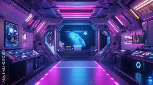 © Qaqas, Obraz premium futuristic modern metal sci-fi space neon room with product stand 3d render illustration