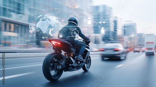 Fototapeta premium Futuristic Motorcycle Rider in Urban Setting with Digital Overlay Representing Global Connectivity and Technology Advancements on Modern City Streets