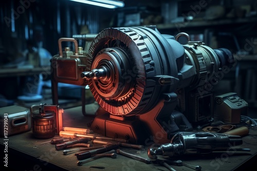 © juliars, Fototapeta premium Futuristic movie camera undergoing maintenance in a dimly lit workshop, surrounded by tools and equipment