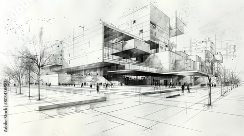 © Riccardo, Fototapeta premium Futuristic museum with geometric structures in an urban setting, surrounded by trees and pedestrians - an artistic architectural rendering