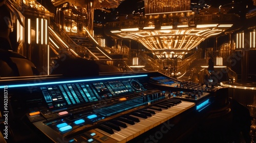 Obraz premium Futuristic music studio with glowing synthesizers and ambient lighting in a vibrant setting