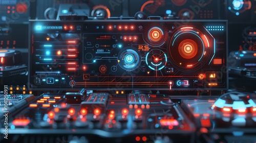© decorator, Fototapeta premium Futuristic neon api interface concept with detailed connection scheme on dark background