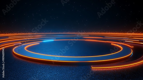 © Ruqqq, Fototapeta premium Futuristic neon circular design on a dark background.