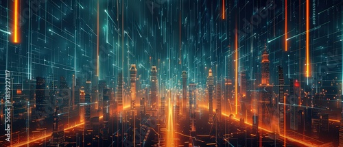 Fototapeta premium Futuristic neon city filled with glowing data streams and digital lights, showing advanced technology, cyber systems and modern urban innovation.