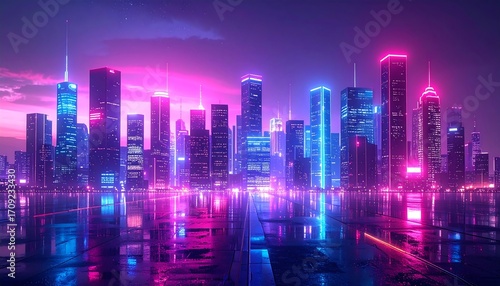 © Sariman, Obraz premium Futuristic neon city skyline at dusk