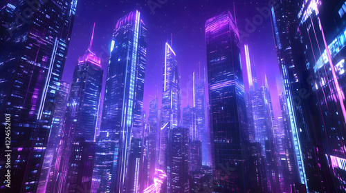 Obraz premium Futuristic Neon City Skyline at Night with Vibrant Purple and Blue Lights