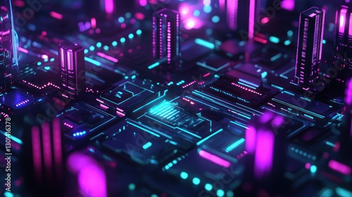 Obraz premium Futuristic neon city with buildings and circuit board designs