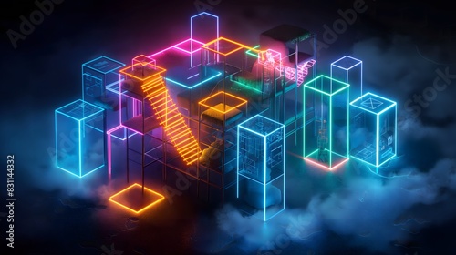 Fototapeta premium Futuristic neon city with glowing staircases and cubes