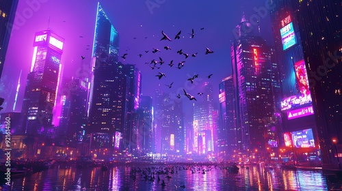 Obraz premium Futuristic neon cityscape at night with glowing skyscrapers, flying birds, and vibrant lights reflected in the water.