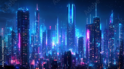 © Rstm, Fototapeta premium Futuristic neon cityscape glowing at night with a starry sky.