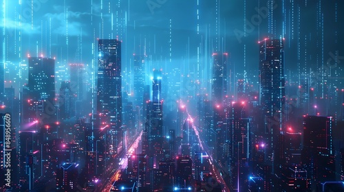 Fototapeta premium Futuristic Neon Cityscape with Cyber Enhanced Towering Skyscrapers and Glowing Digital Backdrop Concept