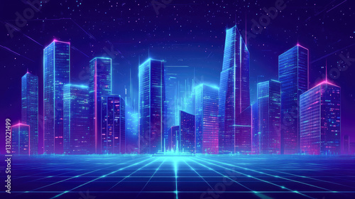 Fototapeta premium Futuristic neon cityscape with cyberpunk skyscrapers under starry night sky
