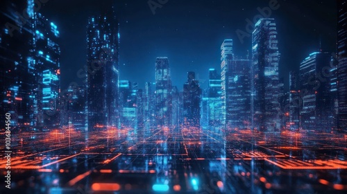 Obraz premium Futuristic Neon Cityscape with Digital Grid and High-Rise Skyscrapers at Night