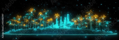 Fototapeta premium Futuristic neon cityscape with digital trees and fireworks in space