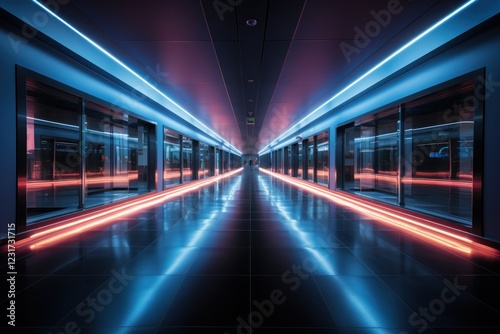 Fototapeta premium Futuristic neon corridor, vibrant lights, reflective floor, data center...