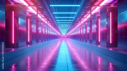 © Putra, Fototapeta premium Futuristic Neon Corridor with Reflections of Pink and Blue Lights