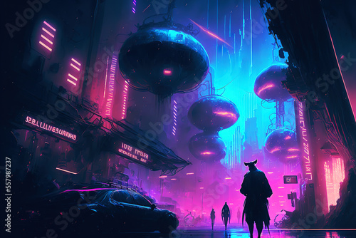 Fototapeta premium Futuristic neon cyberpunk city with the silhouette of an alien hero. Downtown sci-fi concept at night with skyscraper, highway and billboards. Gen Art