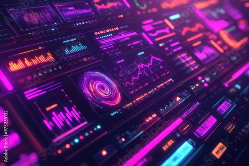 © LOMOSONIC, Obraz premium Futuristic Neon eCommerce Dashboard with AI-Driven Sales Prediction Charts in Cyberpunk Vibes