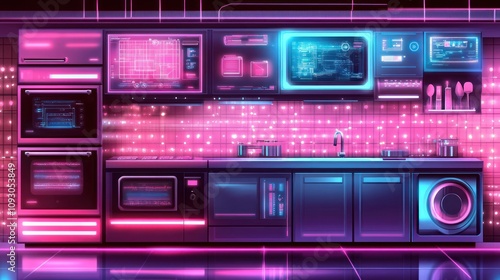 © Penatic Studio, Obraz premium Futuristic Neon Kitchen With Integrated Technology Displays