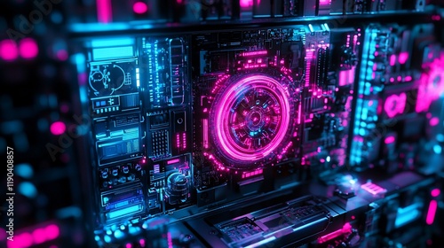 Fototapeta premium Futuristic neon-lit circuit board with glowing central component.