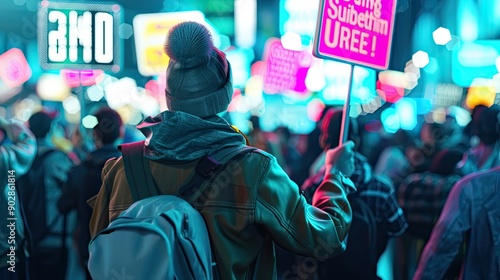 © SSTC AI Photo&Video, Obraz premium Futuristic neon-lit cityscape featuring colorful digital signs reflecting on a wet street at night...