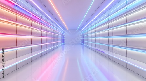 Obraz premium Futuristic neon-lit hallway with symmetrical colorful lights and reflective...