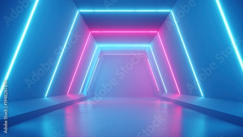 Fototapeta premium Futuristic Neon Lit Tunnel: Geometric Light Installation with Pink and Blue...