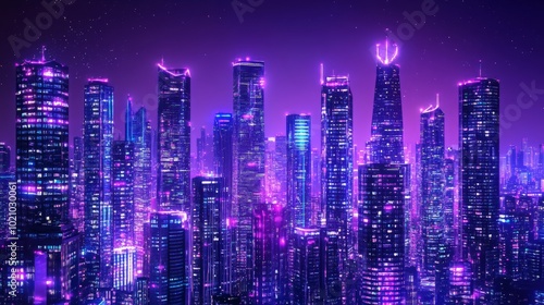Obraz premium Futuristic Neon Metropolis, a vibrant panorama showcasing a sprawling city skyline illuminated by brilliant neon lights, towering high-rises, and a dynamic urban atmosphere.