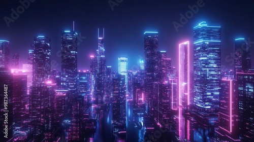 © Bijac, Fototapeta premium futuristic neon metropolis at night glowing skyscrapers and city lights 3d illustration