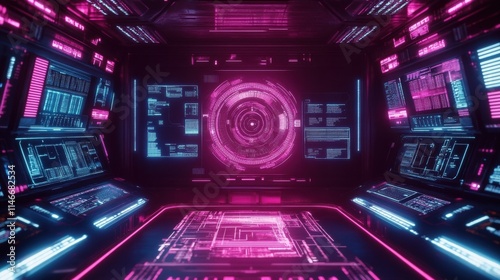 © Sirirat, Fototapeta premium futuristic neon pink and blue sci-fi control room